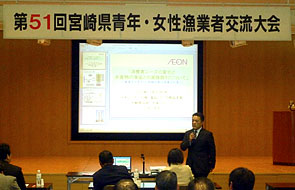 51回宮崎県青年・女性漁業者交流大会は、平成22年1月25日(月)に宮崎県水産会館大研修室で開催された。 今年度は、2件の取組みについて報告された。最初に、「島野浦まき網漁業の改革」と題して島浦町漁協まき網船・加工グループの西口良満氏の報告があり、次に「藻場回復を目指したウニ駆除活動について」と題して、本城・崎田地区潜水漁業生産グループの実藤勇次氏の報告がされた。