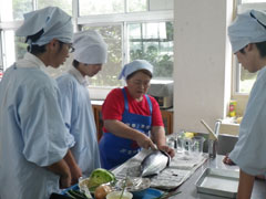 去る6月8日、宮崎県立都城農業高等学校において料理講習会を開催した。 南郷漁協女性部2名を講師に迎え、ライフデザイン3年生、職員24名が参加した。 かつおを捌くところでは、頭の骨がなかなか切れなかったり、包丁の入れ方に苦労したりしていたが、ケガもなく実習を行うことが出来た。 6月22日には、高城高校にて開催し、日南市漁協女性部3名にご協力いただき、生活情報科38名が参加した。講師の捌きの場面では、内臓を取り出す際に心臓や胃の中の餌であるイワシを取り出して見せたり、漁法についての説明も織りまぜ、生徒達は食い入るように見入っていた。実習ではかつおまるごと1尾を悪戦苦闘しながらも一生懸命調理していた。 かつおのたたき・かつお飯・かつおカツを作り、出来上がった料理の普段とは一味も二味も違う魚のおいしさに顔をほころばせる生徒ばかりだった。