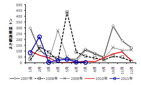 ◆日向灘南部大型定置網に入網したサバ仔(0歳魚)の推定漁獲量(雑魚に占める割合から算出)は4-5月で249トン、前年の7倍、平年の10倍で大量に入網した。漁獲サイズは、3月が尾叉長7-10cm台、4月が10-13cm台、5月が9-18cm台モードであった。 |