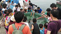 宮崎市漁業協同組合が主催する青島漁港いせえび祭りは、平成24年9月22日(土)、曇雨天の中、午前9:00から午後2:00まで会場の宮崎市漁業協同組合荷捌所で開催されました。その内容は、@いせえび販売を始めA鮮魚販売のほか、集客イベントとしてB午前12:00からマグロの解体ショー(12:30から試食300名限定)Cハモちゃんバーガー早食い選手権(参加枠子供10名大人5名)D釣り堀(参加枠100名程度)Eいせえびみそ汁のふるまい(午前8:30〜整理券配布)500名限定Fいせえびなどが当たるお楽しみ抽選会が行われました。県内最大の漁獲量を誇る当漁協では、準備したイセエビ約1,000kgを時間内に完売しました。来場者は約5,000人の参加でした。