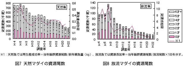 図7と図8にマダイ資源尾数の経年変化を天然魚と放流魚に分けて示しました。天然魚資源尾数は平成6年をピークに翌年から右肩下がりに減少しています。なぜでしょうか。この原因の一つと考えられるのは「親が沢山いるのに子が少ない」という現象が平成7年以降継続して起きていることです。また、放流魚資源尾数も天然魚と同様に減少傾向にありますが、これは「放流しても資源に加わるのは少しだけ」という現象が平成8年以降継続して起きているからだと考えています。これらの現象がなぜ起きたのかという部分については明らかになっていません。