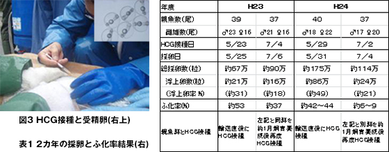 | 採卵にあたり、魚体重約500〜550gの養殖マサバに、ヒト絨毛性性腺刺激ホルモン(HCG)を魚体重1kgあたり500IUの割合で背筋部に注射投与しました(図3)。投与後、陸上の飼育水槽内で自然産卵させ、産出された卵はHCG投与の2日後の早朝(約40時間後)、採卵ネットから回収しました。1群約40尾あたり、約70〜170万粒の卵が得られました。回収卵は、一旦30Lのパンライト水槽内に収容した後、浮上卵と沈下卵に分離後、浮上卵を仔稚魚飼育水槽(5kL)に収容したところ、翌日にふ化が確認されました。2カ年の結果を表1に示しました。 |