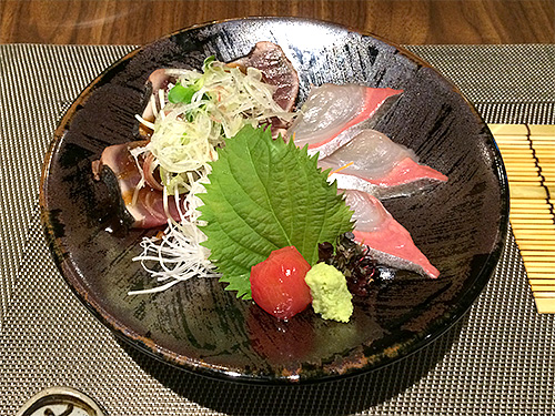メニューの「初かつおの焼っ切り」は、皮つきの刺身を強火で炙った一品で、皮の面だけ炙り、氷水でしめない点が宮崎独特の「焼っ切り」である。