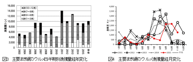 ◆まき網の漁獲量は、0歳魚を主体に9月以降平年を上回り、下半期全体では前年を上回りましたが、平年並となりました(図3、4)。