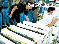シイラは成長の早い魚で、秋に30〜40cmだったものが翌春にはその2倍の70cm位になり、1年で1m以上にもなります。 本県では、延縄、曳縄、旋網で漁獲されたり、又シイラが流木などにつく性質を利用して、シイラ漬けという漁法もあります。さらには、近海カツオ一本釣りでカツオと一緒に釣れます。刺身で食べたり、塩焼きやてんぷら等どんな料理にも使える美味しい魚です。 |